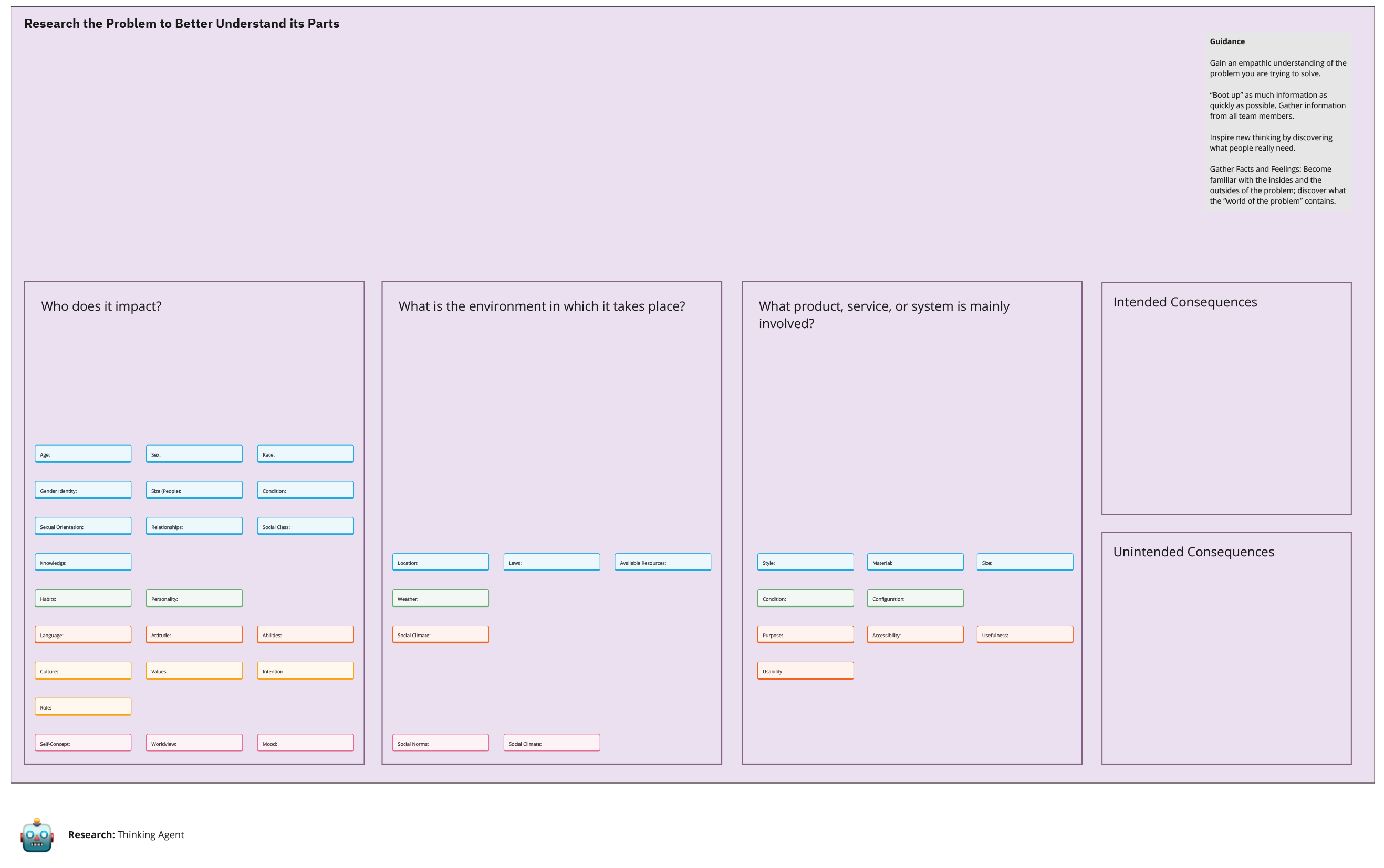 - Research the opportunity’s context, background, people, design, and other aspects. Work at the systems level. Identify AIs’ and people’s roles and how they relate to the opportunity. During this step, learn all you can about the opportunity so you have building blocks to work with when designing solutions. Use generative AI to assist your research process.