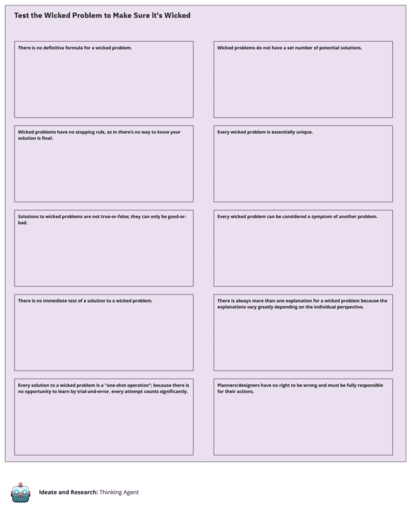 Select a “wicked” or socially derived problem. Use what we learned about Wicked Problems to guide your selection criteria. Generative AI will help you along the way. After completing a design process from problem definition to solution development and testing, students will create a poster in Miro to report their work.